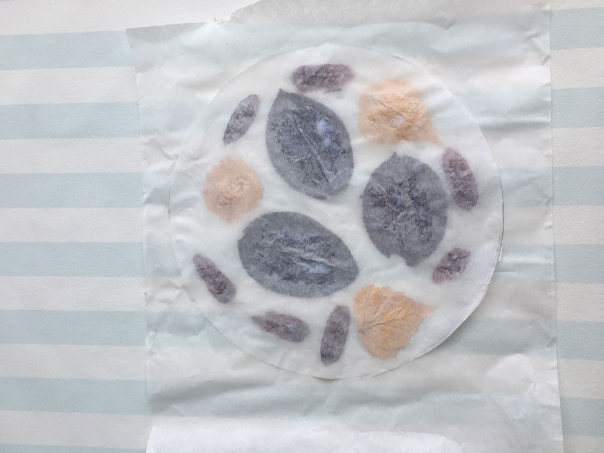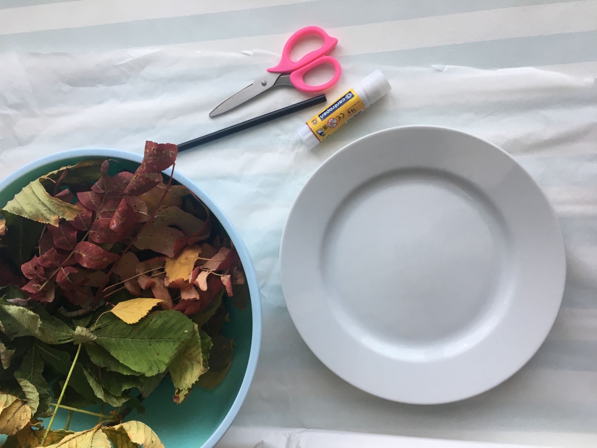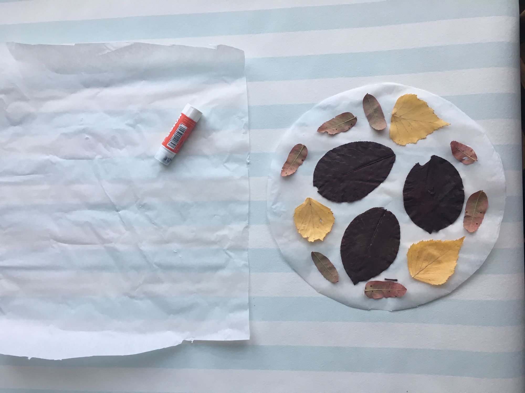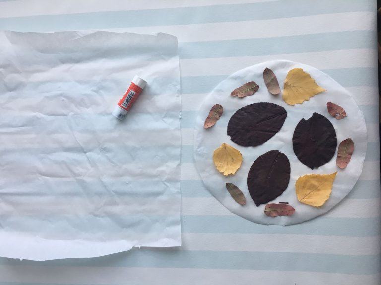 Na připravený papírový kruh můžeme začít lepit listy. Používejte spíše menší a drobnější, ať vám neprotrhnou papír poté, co na ně budeme lepit další vrstvu papíru. Kombinujte různé velikosti lístků.